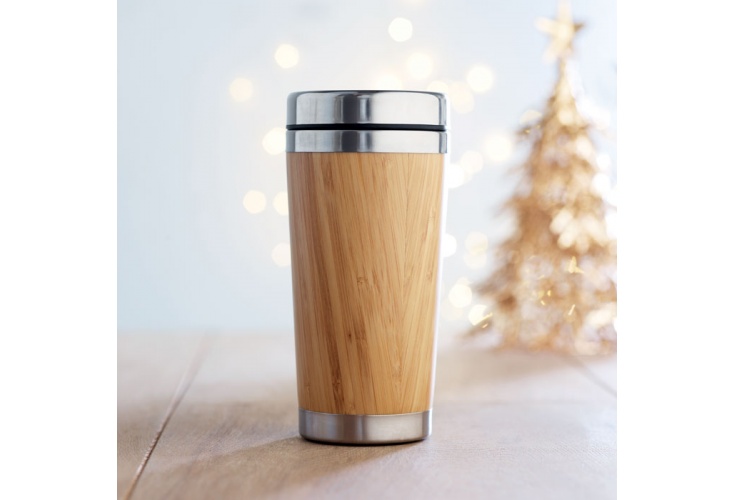 Cestovný dvojstenný nerezový hrnček s PP viečkom a bambusovou vonkajšou stranou. Kapacita 400 ml.