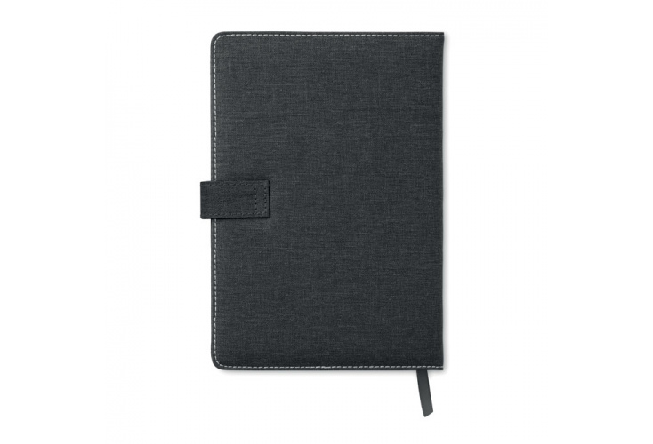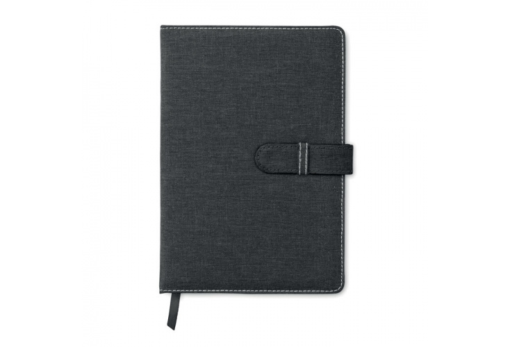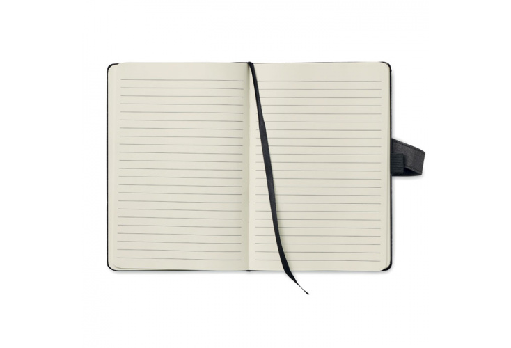 A5 zápisník, obálka z plátna so vzhľadom džínsoviny. 80 linkovaných stránok. Zatvárací páska, držiak ceruzky a stuha.