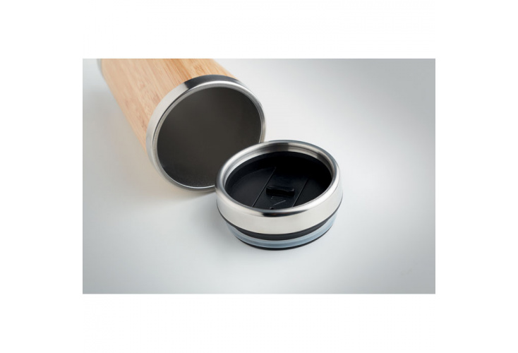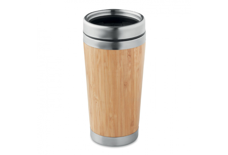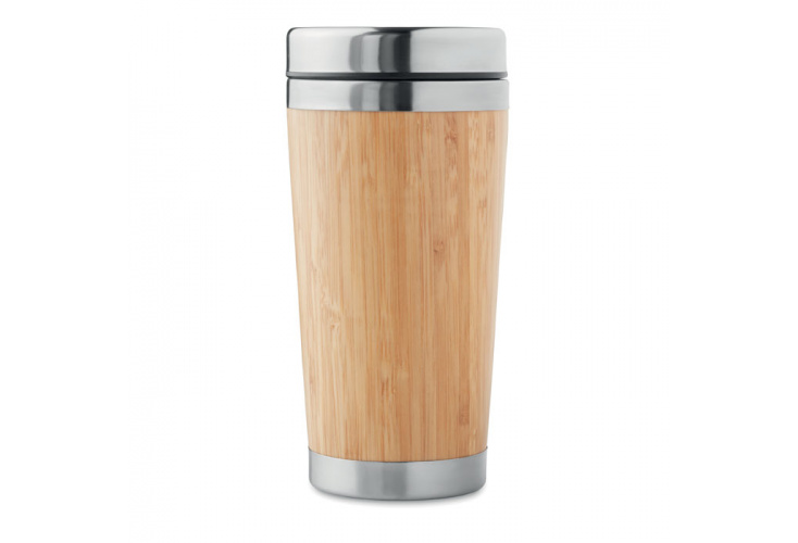 Cestovný dvojstenný nerezový hrnček s PP viečkom a bambusovou vonkajšou stranou. Kapacita 400 ml.