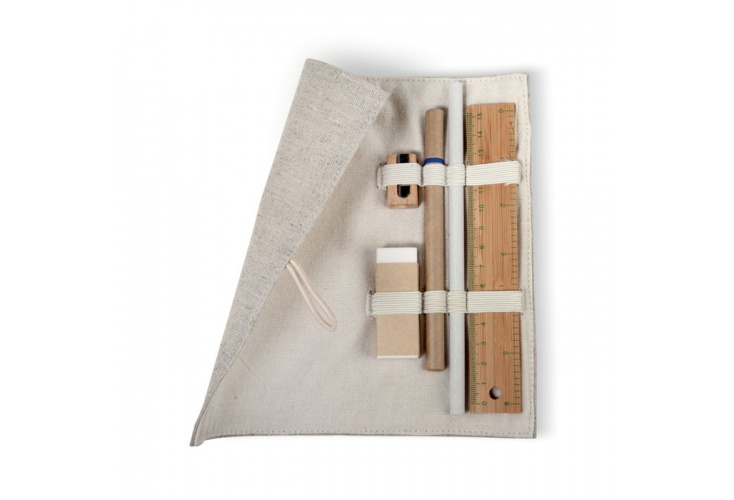 Sada kancelárskych potrieb v puzdre z juty a bavlny obsahuje bambusové pravítko, ceruzku s papierovým telom, kartónové guličkové pero s modrou náplňou, drevené strúhadlo a gumu.