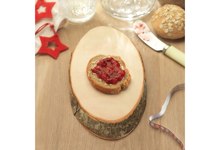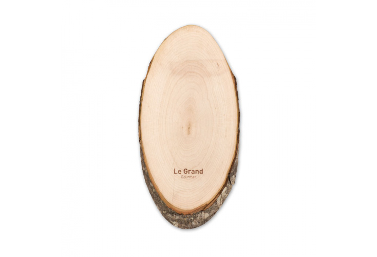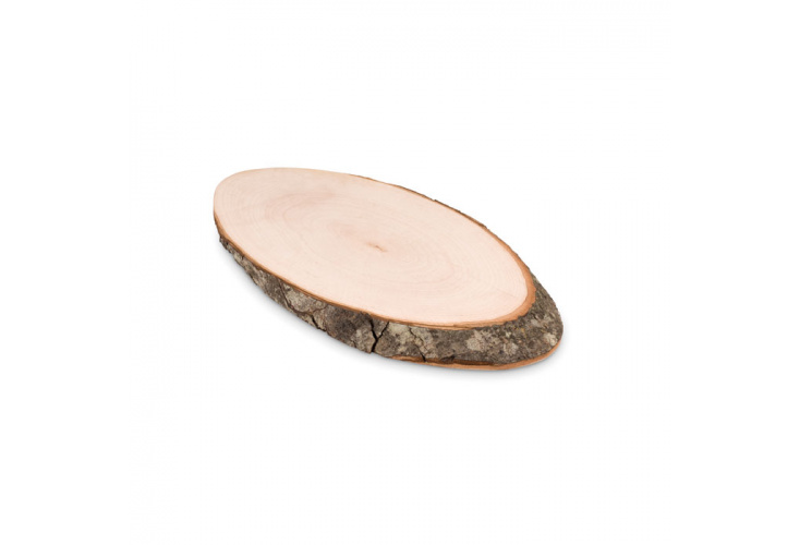 Oválna drevená doska s kôrou.