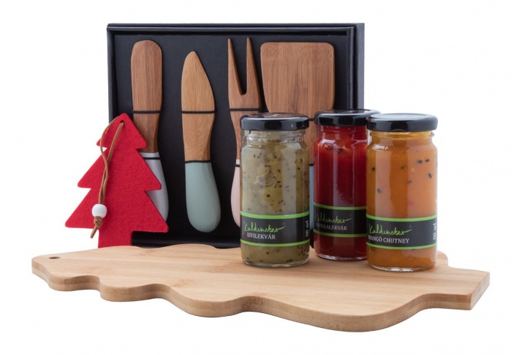 Darčekový Syrový set obsahuje sadu bambusových nožíkov na syr, bambusové doštička na krájanie, pohár ručne vyrobeného "Kaldeneker" mango chutney (80 ml), kiwi džem (80 ml) a paprikový džem (80 ml) a vianočné ozdobu z filcu. V kartónovej darčekovej krabici s červenou stuhou.