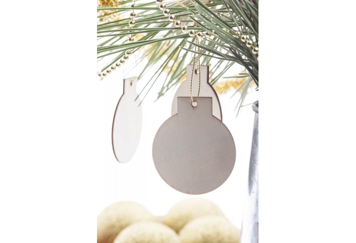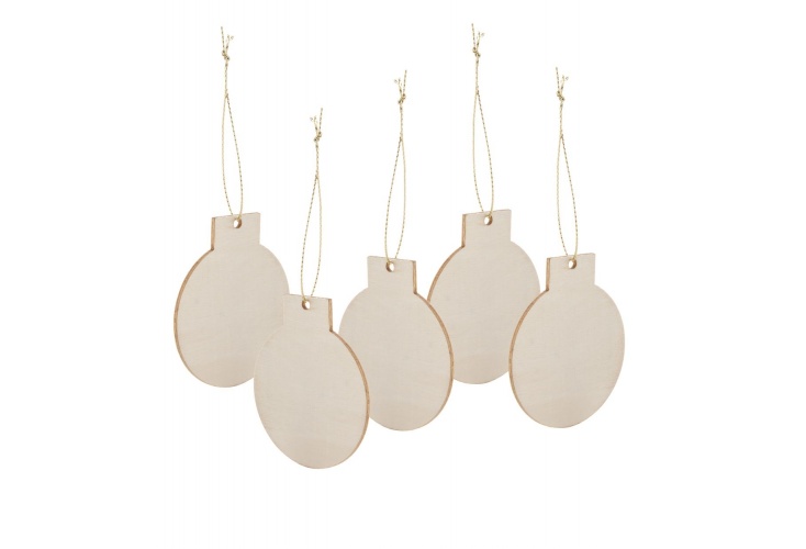 Drevené vianočné ozdoby na stromček so zlatou šnúrkou, 5 ks. Dodávané s priloženými šnúrkami.