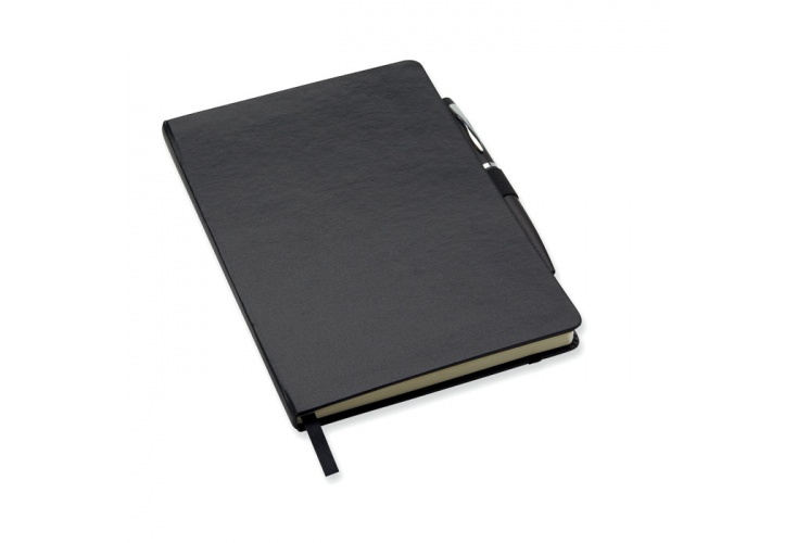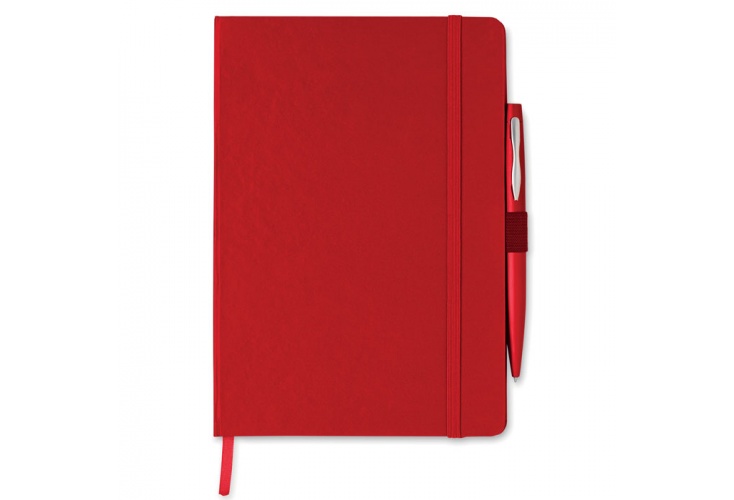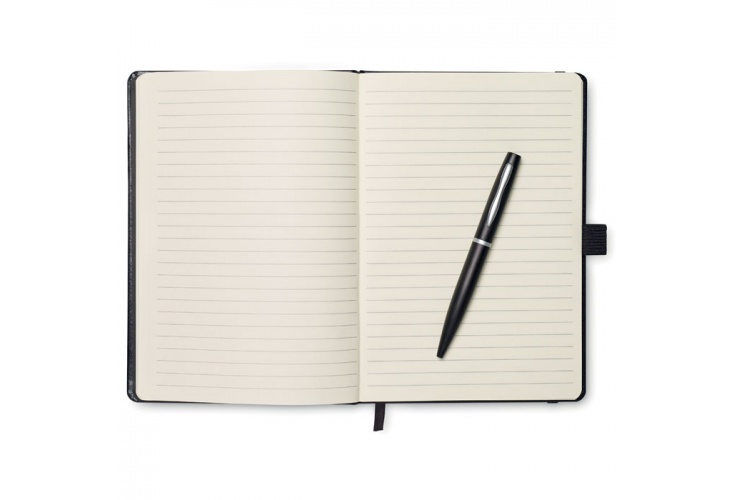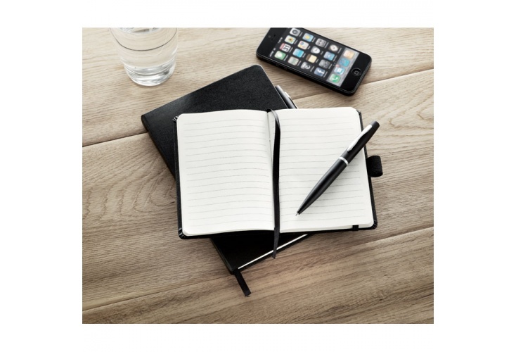 A5 blok sa záklopom. 72 strán, linajkový papier, gumička a držiak so stuhou. Obsahuje kovové guličkové pero s modrým atramentom.
