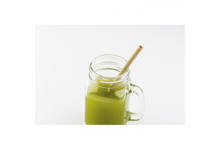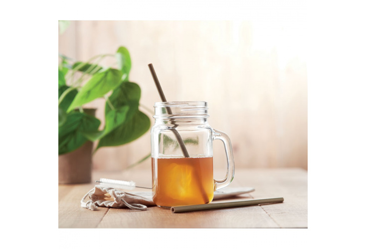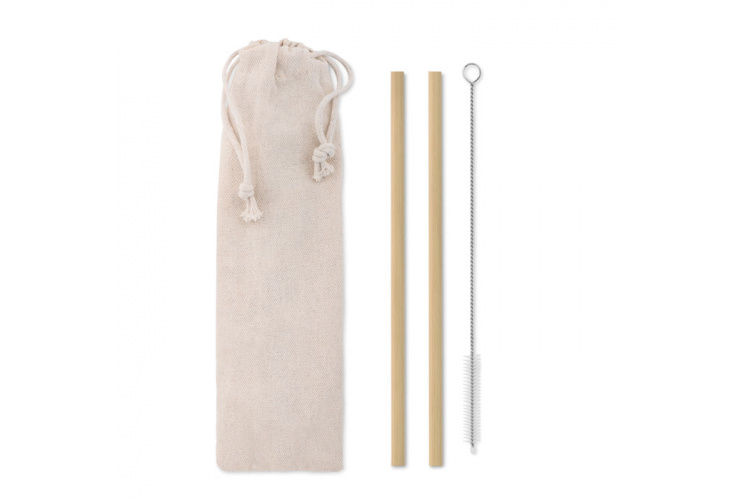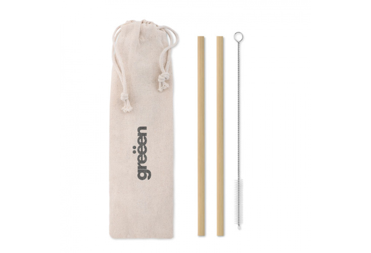 Set dvoch znovu použiteľných bambusových slamiek a nerezového čistiaceho kefky v puzdre z bavlny. Bambus je prírodný materiál, vzhľad môže byť premenlivý.