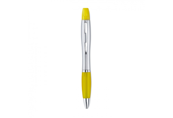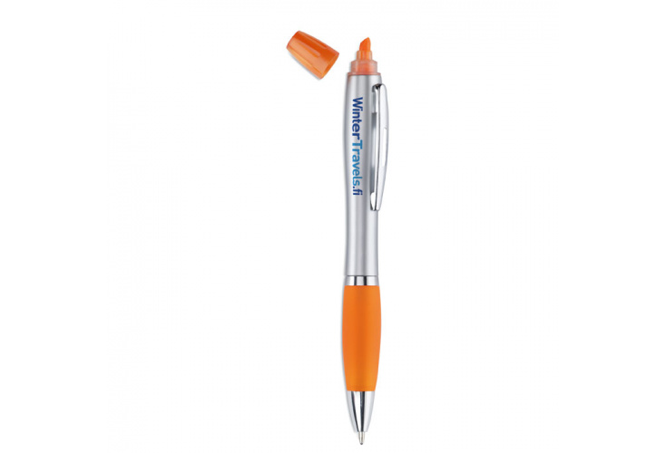 2 v 1 plastové pero a zvýrazňovač v matnom striebornom prevedení. Modrý atrament.