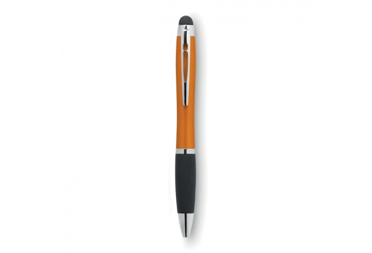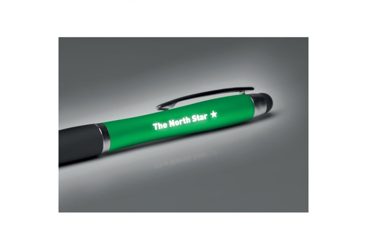 Guľôčkové pero z ABS sa stylusom a mäkkým gripom. Modrá náplň. Telo obsahuje svetlo pre osvietenie gravírovaného loga pri stlačení stylusu. Nefunguje pre tampón tlač. 3 AG3 batérie sú priložené.