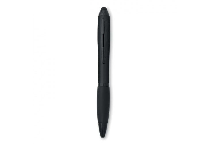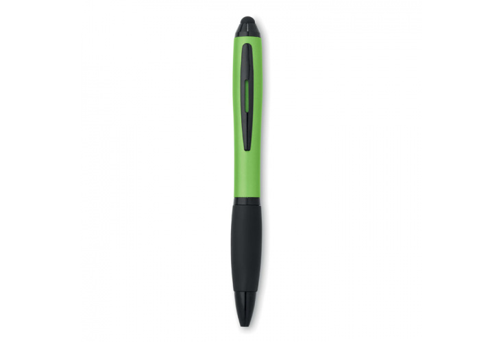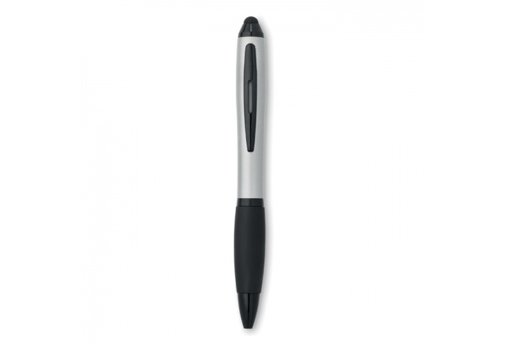 Otočné ABS pero v metalickom vzhľadu sa stylusom. Modrý atrament.