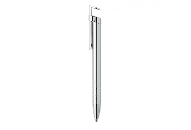 Hliníkové guľôčkové pero so stojanom na mobil. Modrá náplň.
