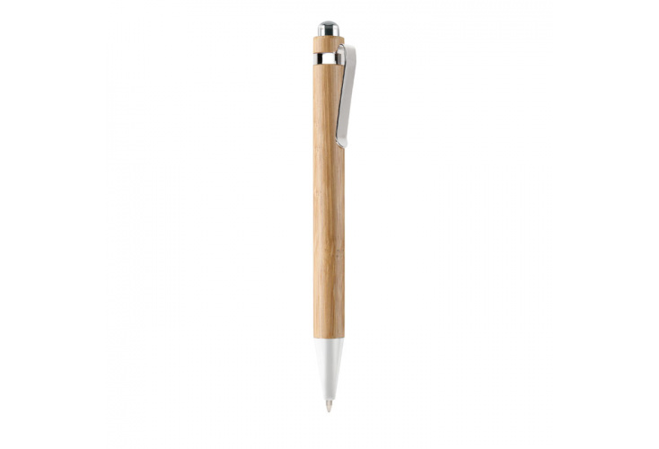 Bambusové guličkové pero s kovovými doplnkami a modrým atramentom.
