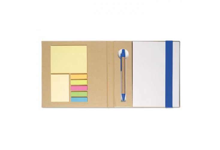Recyklovaný zápisník s lístkami na poznámky, papierové pero a poznámkový blok.