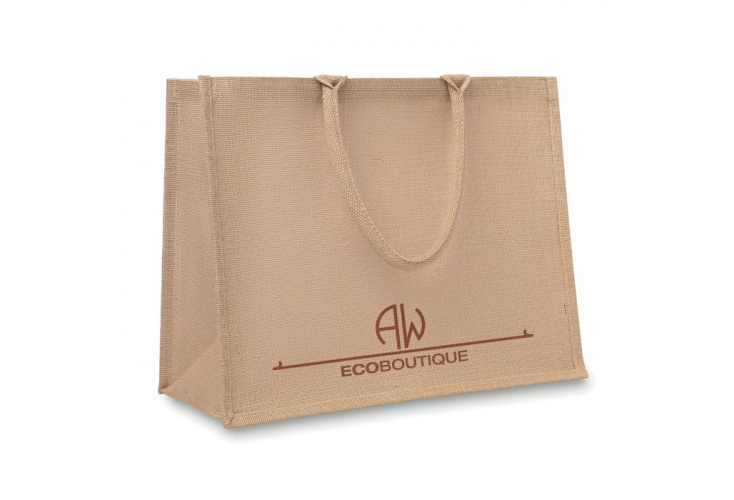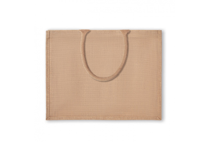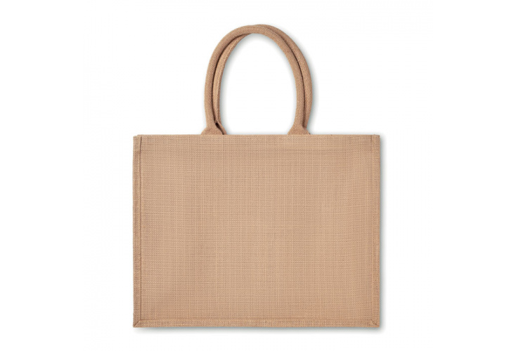 Laminovaná nákupná taška z juty s krátkymi uchami.